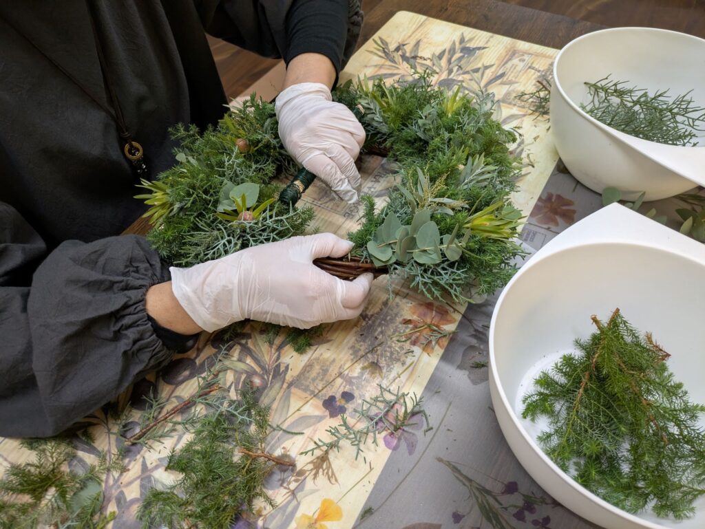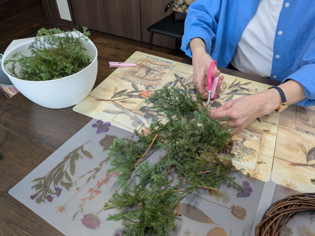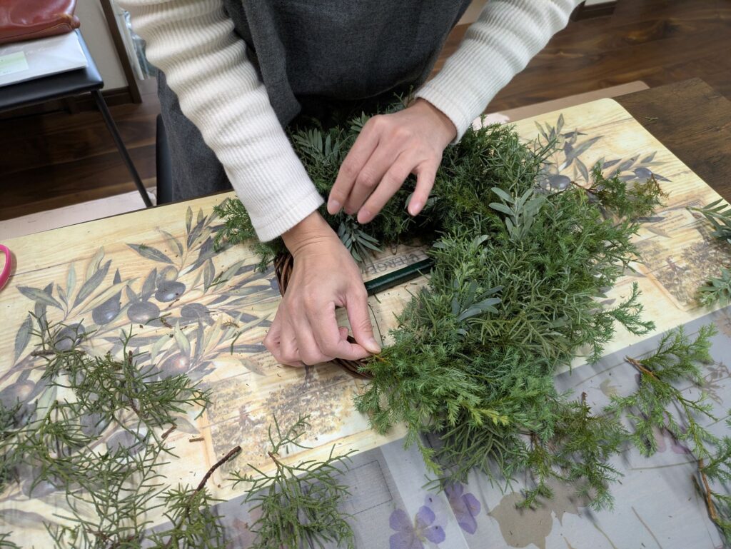 お二人ともフレッシュグリーンリース作りは初めてでした!