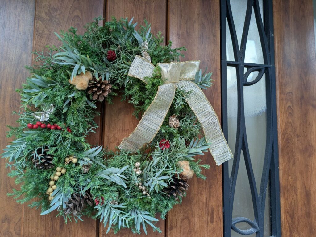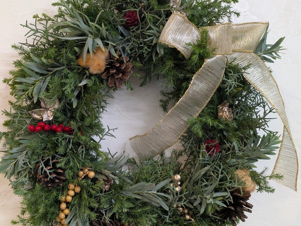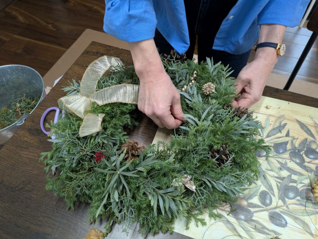 グリーンリースが出来上がったら、リボンやオーナメントを飾り付けていきます。