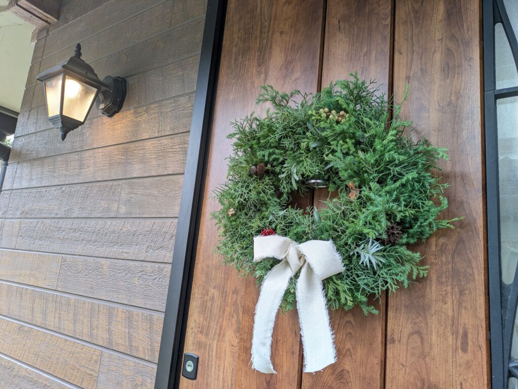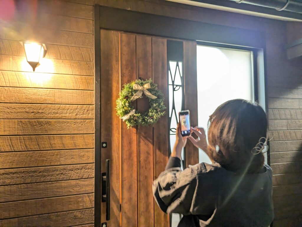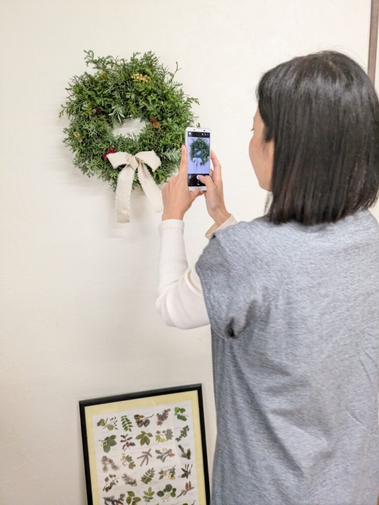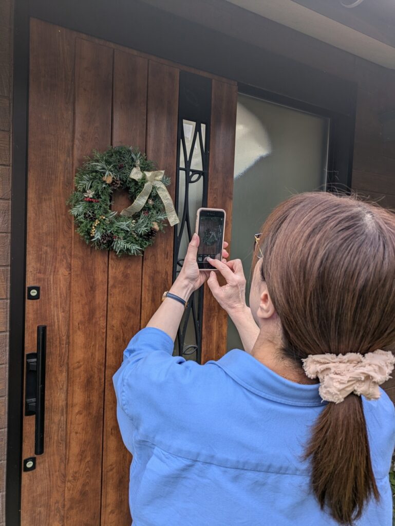 完成したリースは、アトリエの玄関に飾ってフォトタイムです。