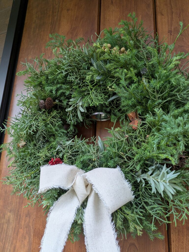 Atelier Laulierのフレッシュグリーンリースは、常緑樹のサツマスギ(ヒムロスギ)、コニファーのブルーアイスをメインに使っています。